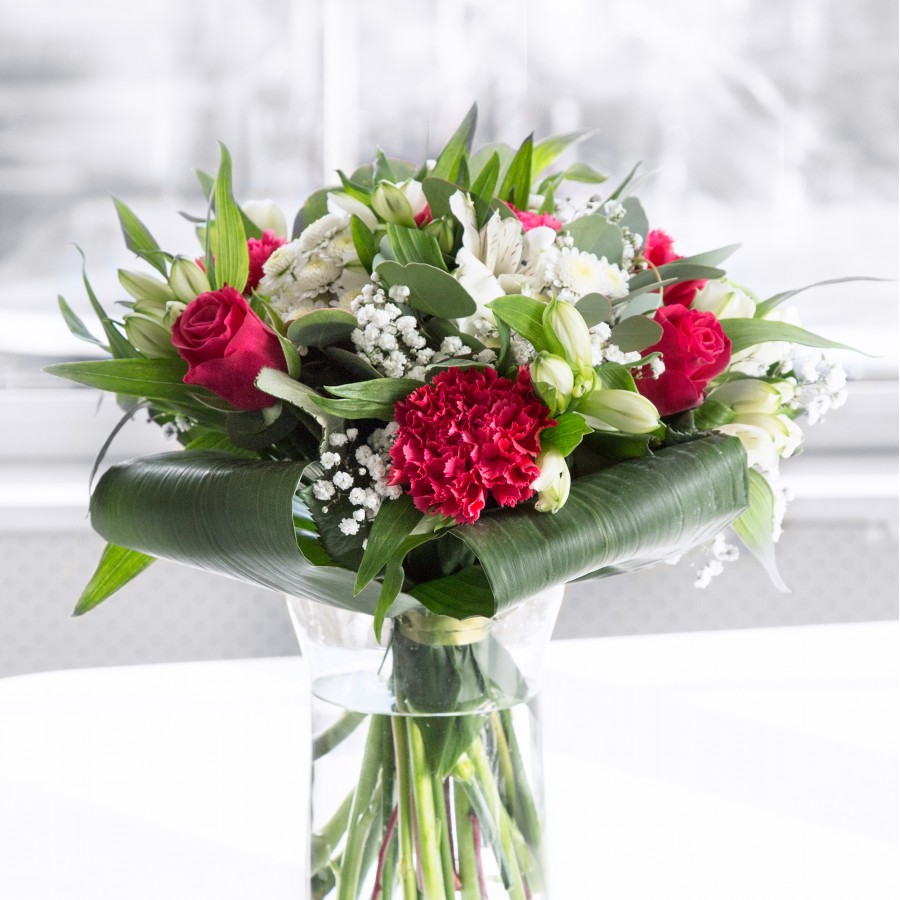 Experience the finest in floral design with our deluxe nature-inspired bouquet. Every bloom is carefully selected by our expert florists to ensure stunning quality and lasting freshness. This arrangement features an elegant blend of red roses, white chrysanthemums, and delicate carnations, all harmoniously intermixed with soft gypsophila and white alstroemeria. Finished with lush aspidistra leaves, it offers a feast for the eyes and a lasting impression.