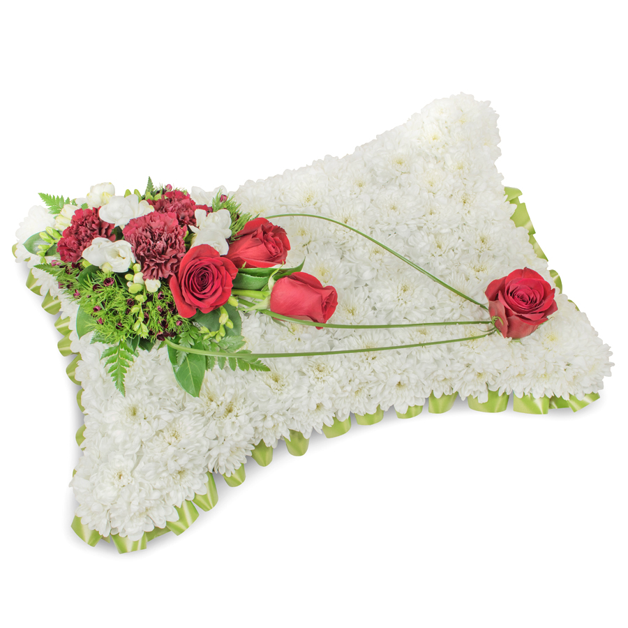 Show your support and sympathy with our elegant condolence flower arrangement. This meticulously crafted bouquet features a beautiful blend of white chrysanthemums, red roses, white freesias, dark red carnations, accented by dianthus and bear grass, creating a heartfelt and visually stunning display.
